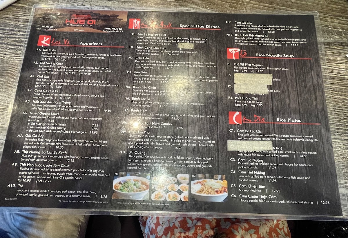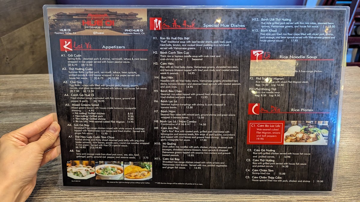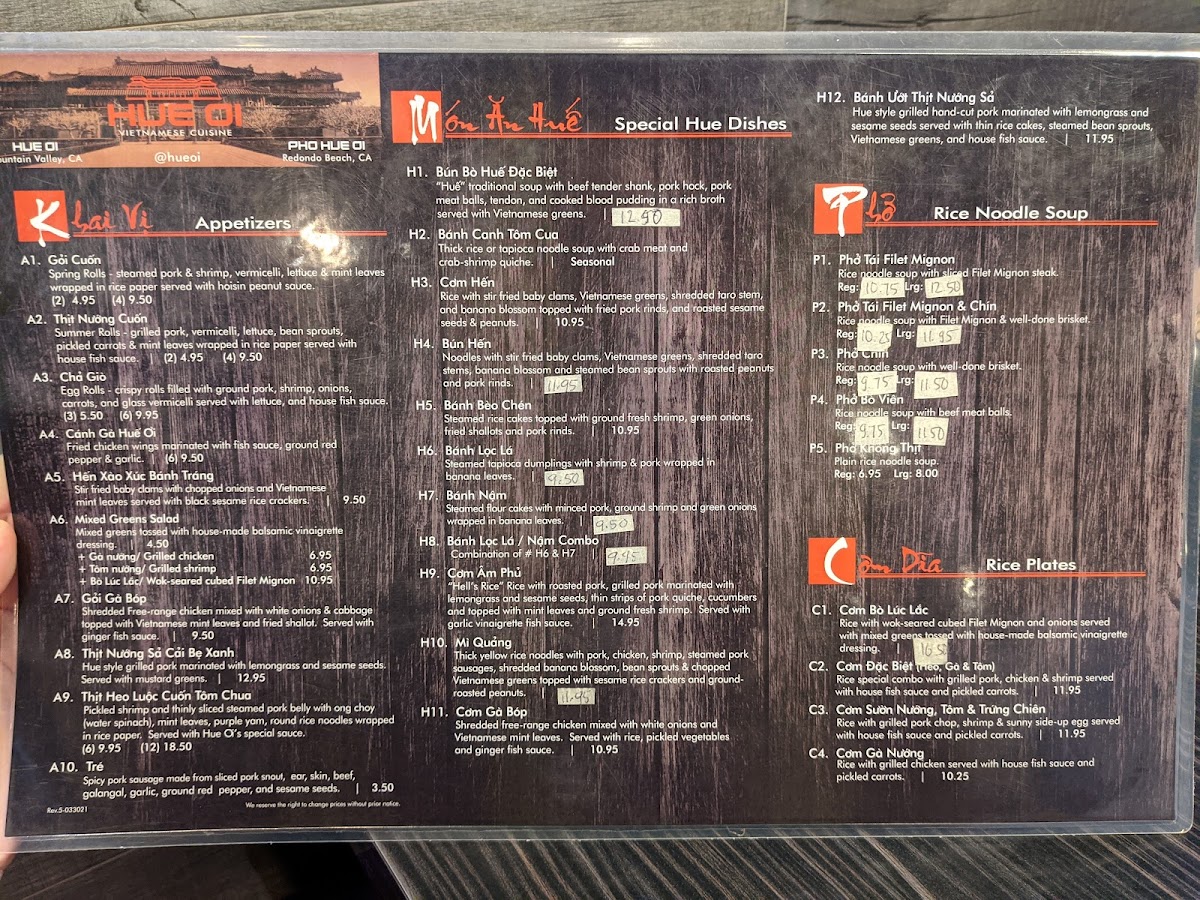 In conclusion, Hue Oi Vietnamese Cuisine provides a comprehensive menu that captures the essence of Vietnamese cooking, from pho to banh mi, and regional specialties. The blend of flavors, fresh ingredients, and variety of options makes it an excellent choice for anyone craving authentic Vietnamese cuisine in Fountain Valley.