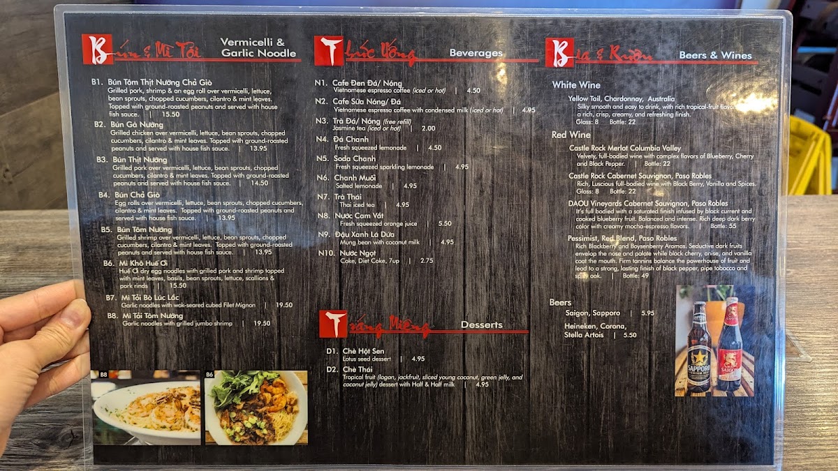 The Vermicelli & Garlic Noodles menu offers a range of light yet satisfying choices, including Bun Dac Biet (with pork, chicken, and shrimp) and Bun Thit Nuong (grilled pork).